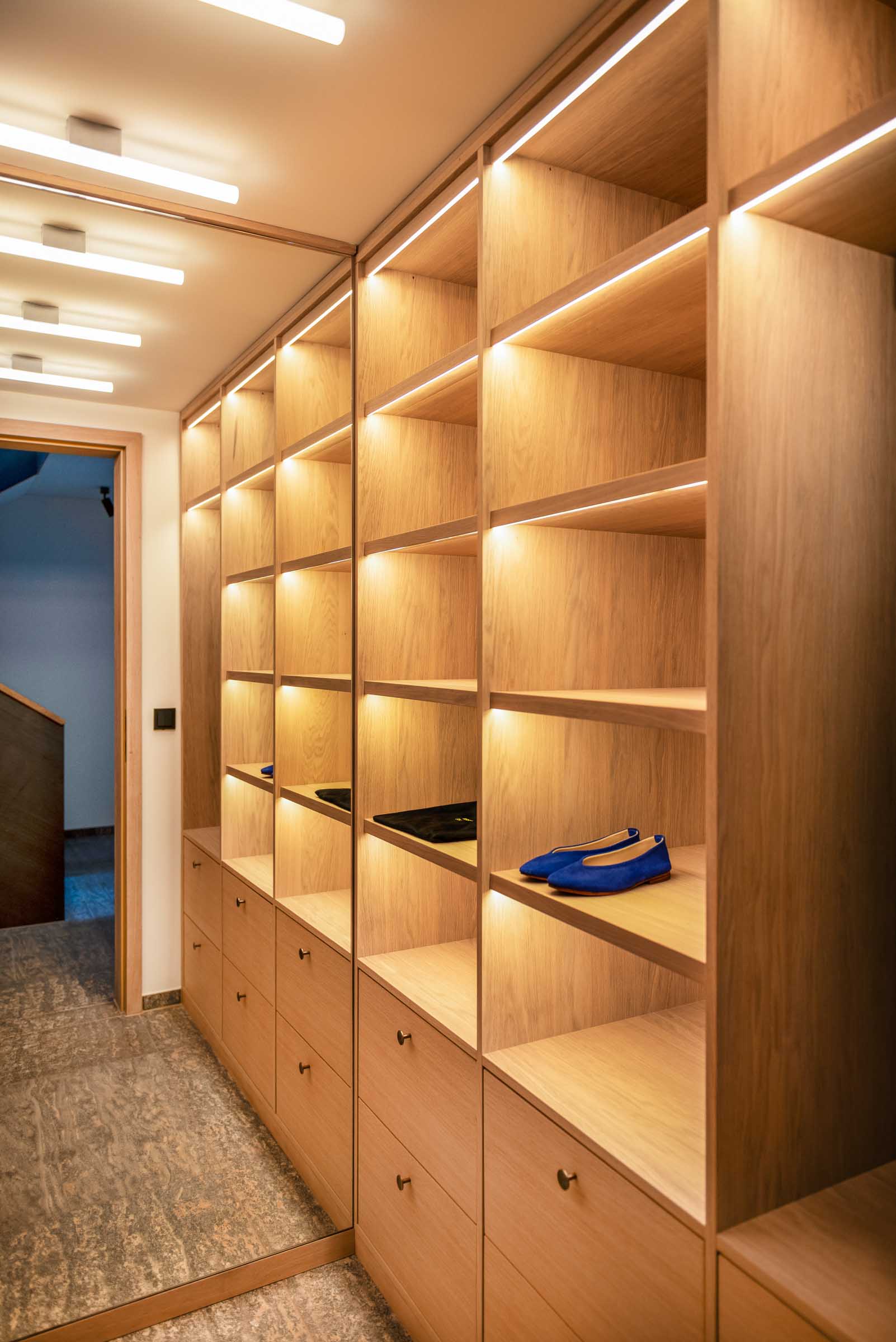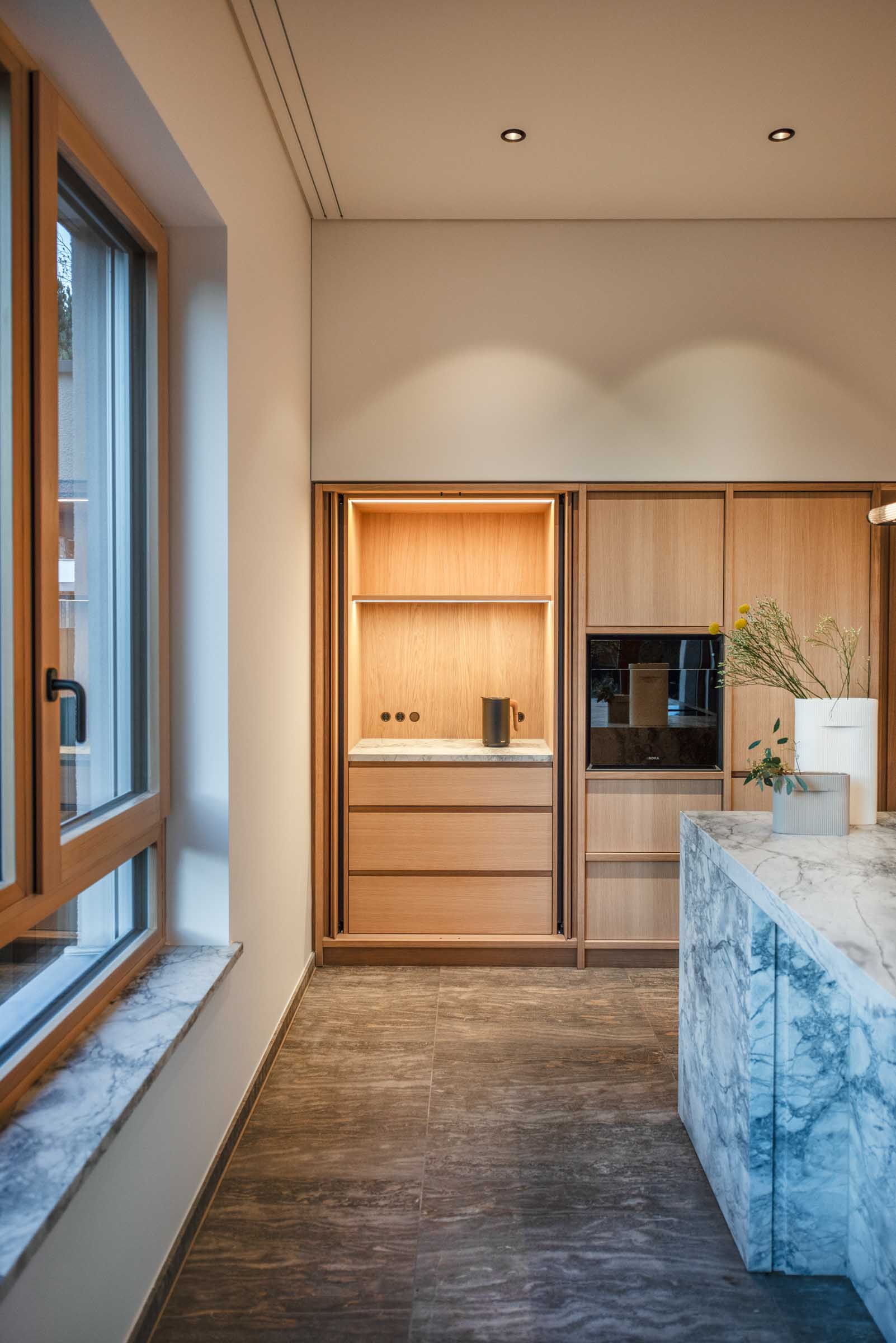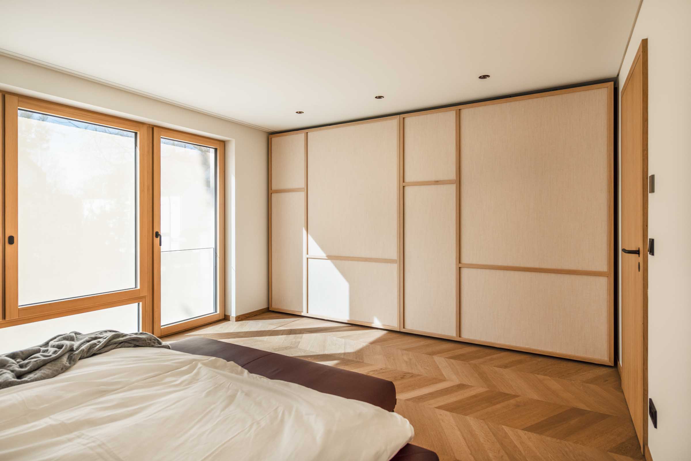 Natürliche Materialien, feine Texturen und Lichtführung prägen das Innenleben – ergänzt durch individuell entwickelte Details wie eingelassene Griffe, zurückhaltende Schrankfronten oder Überraschungsmomente im Inneren einzelner Möbelstücke.