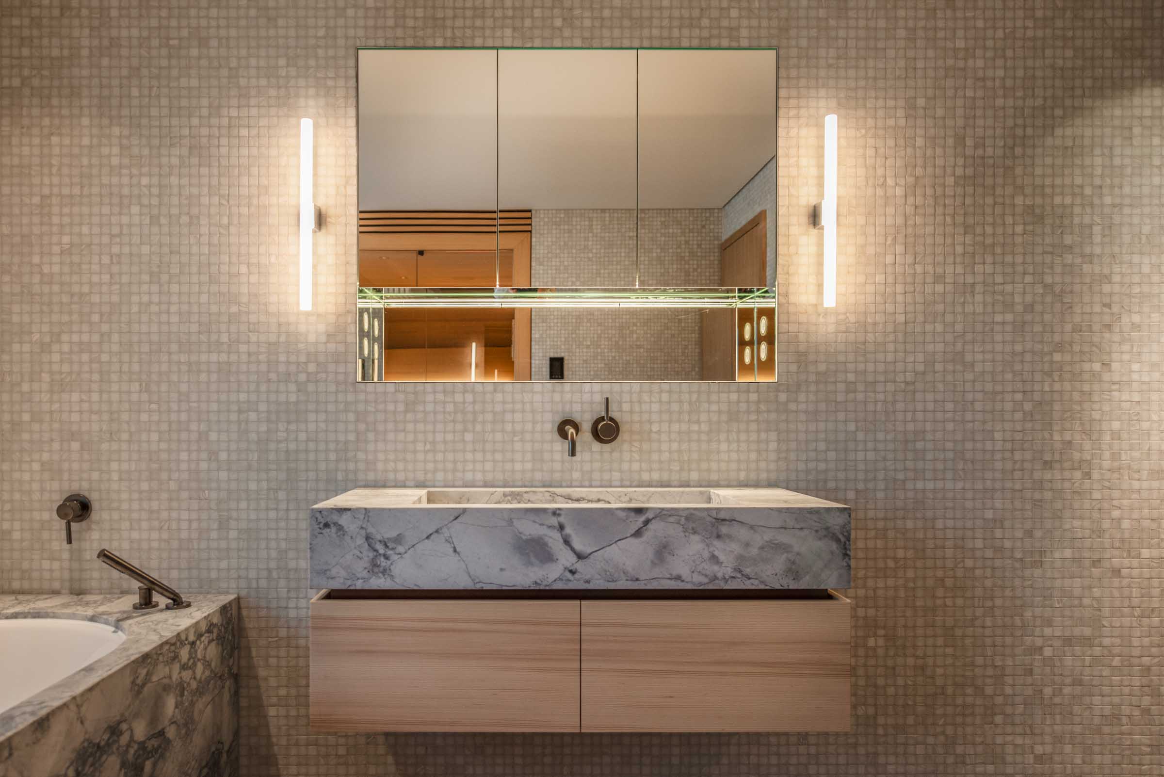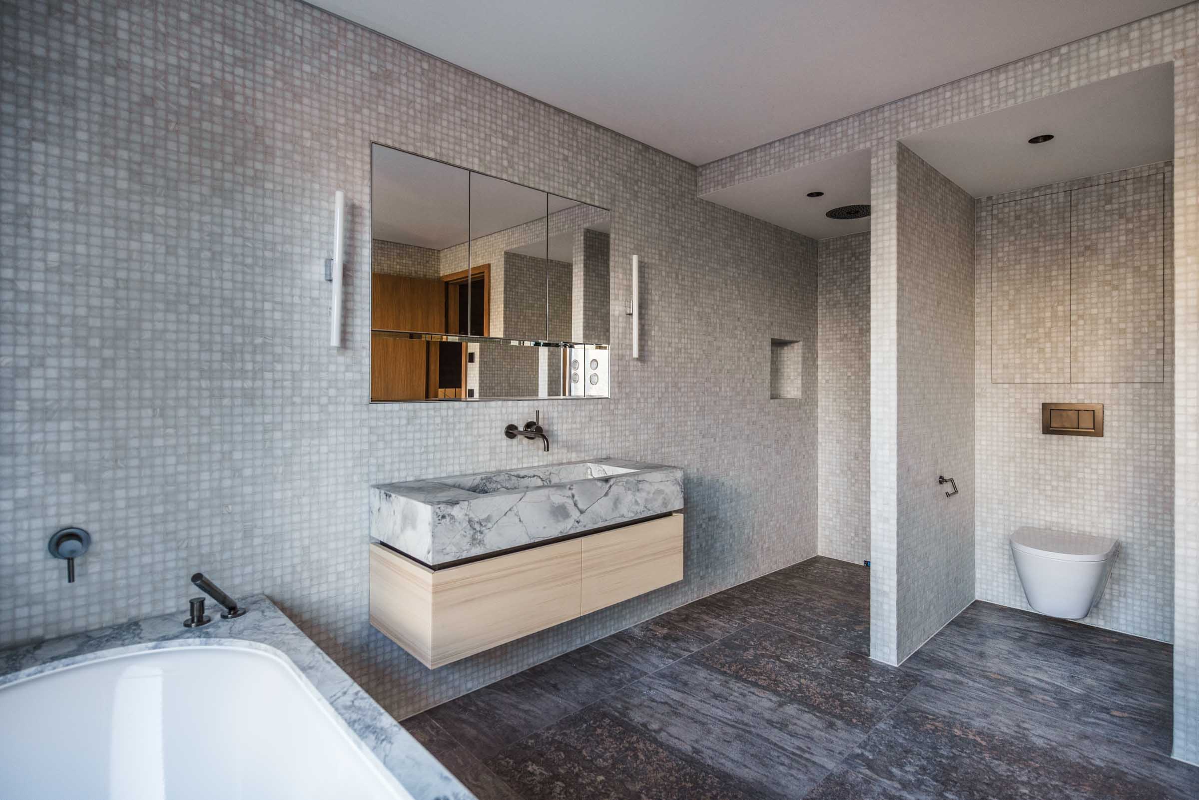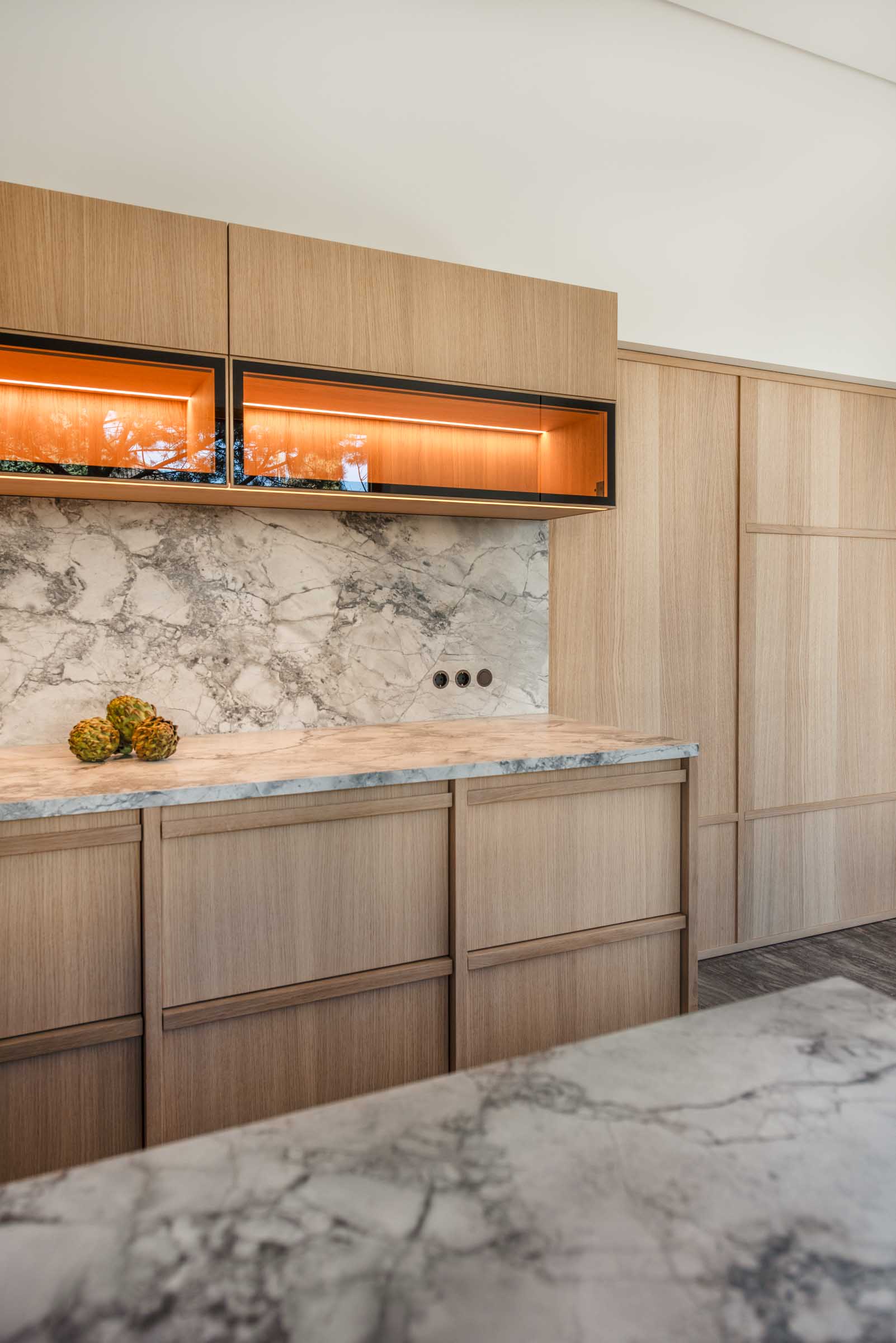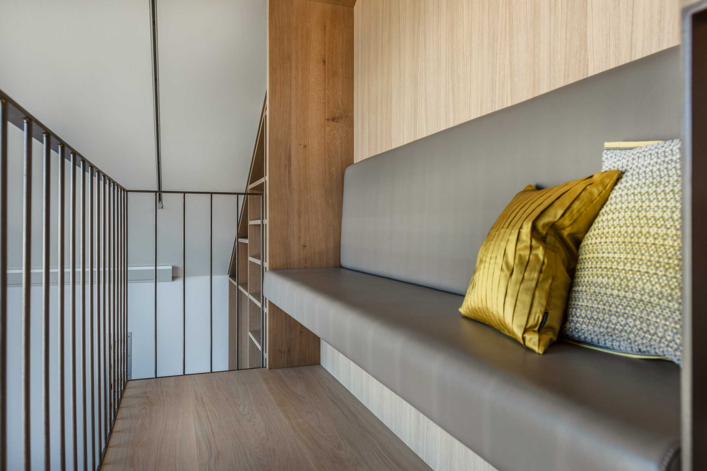 Natürliche Materialien, feine Texturen und Lichtführung prägen das Innenleben – ergänzt durch individuell entwickelte Details wie eingelassene Griffe, zurückhaltende Schrankfronten oder Überraschungsmomente im Inneren einzelner Möbelstücke.