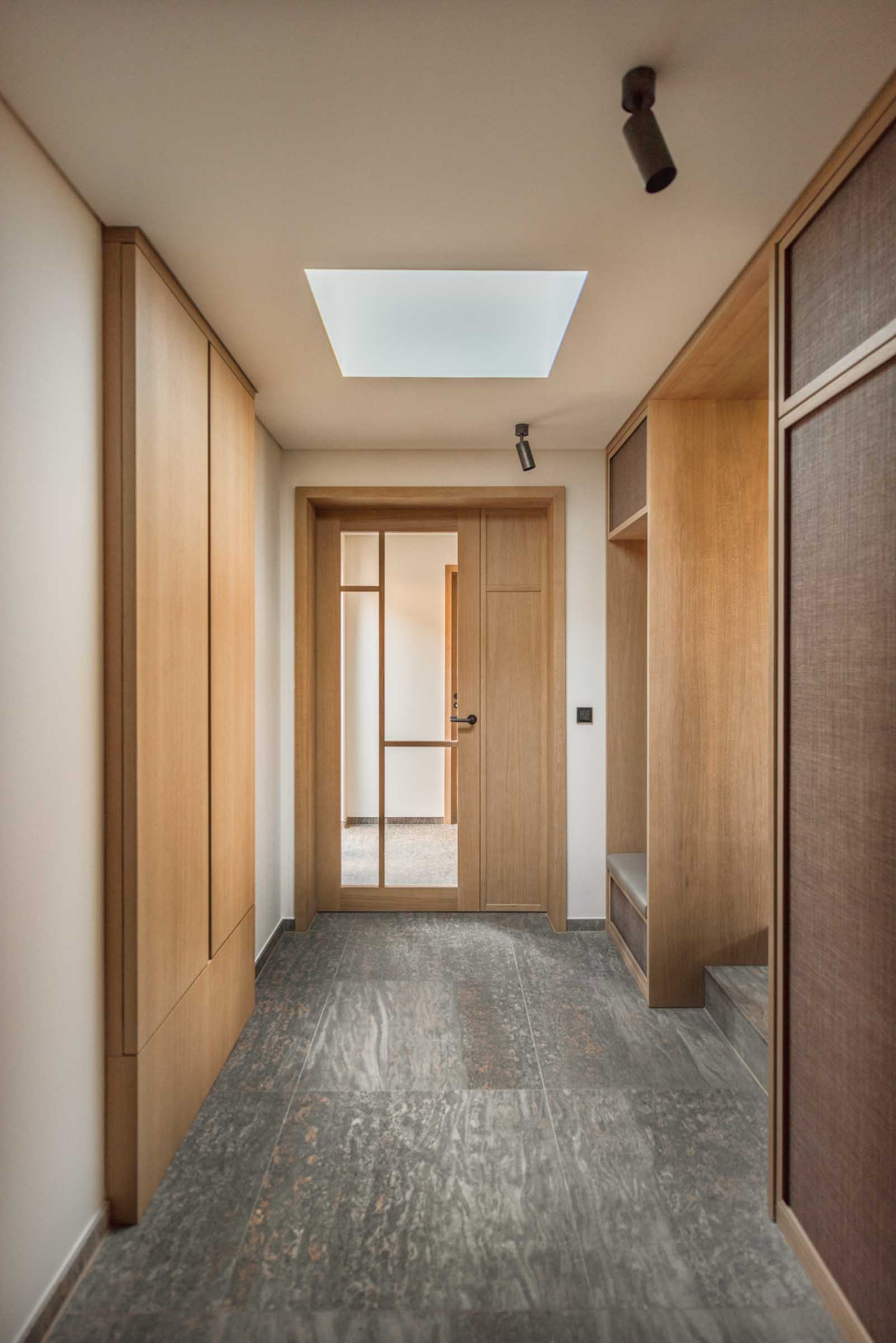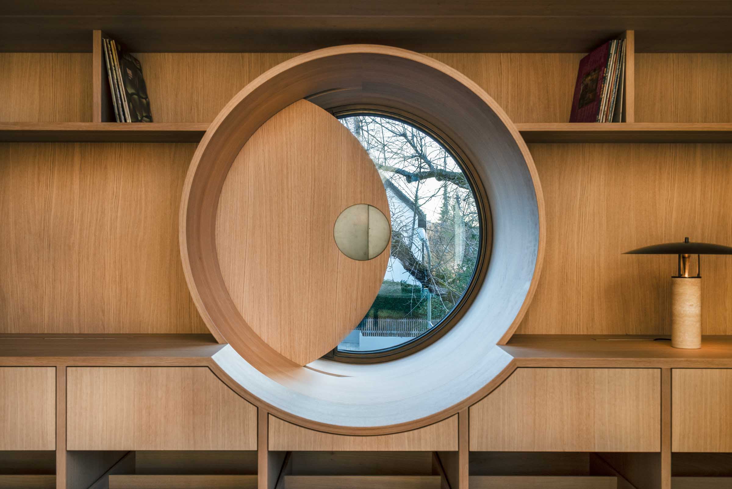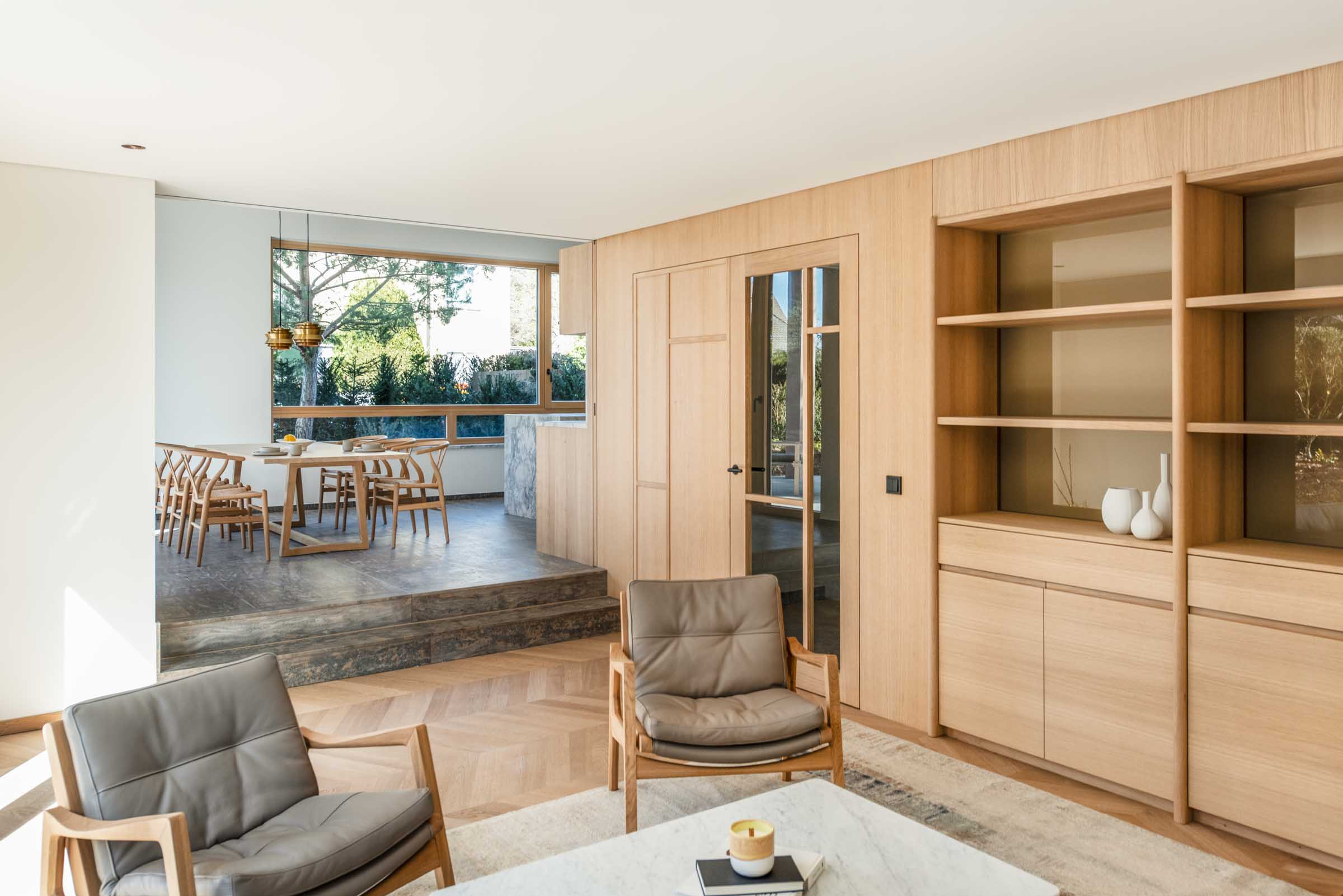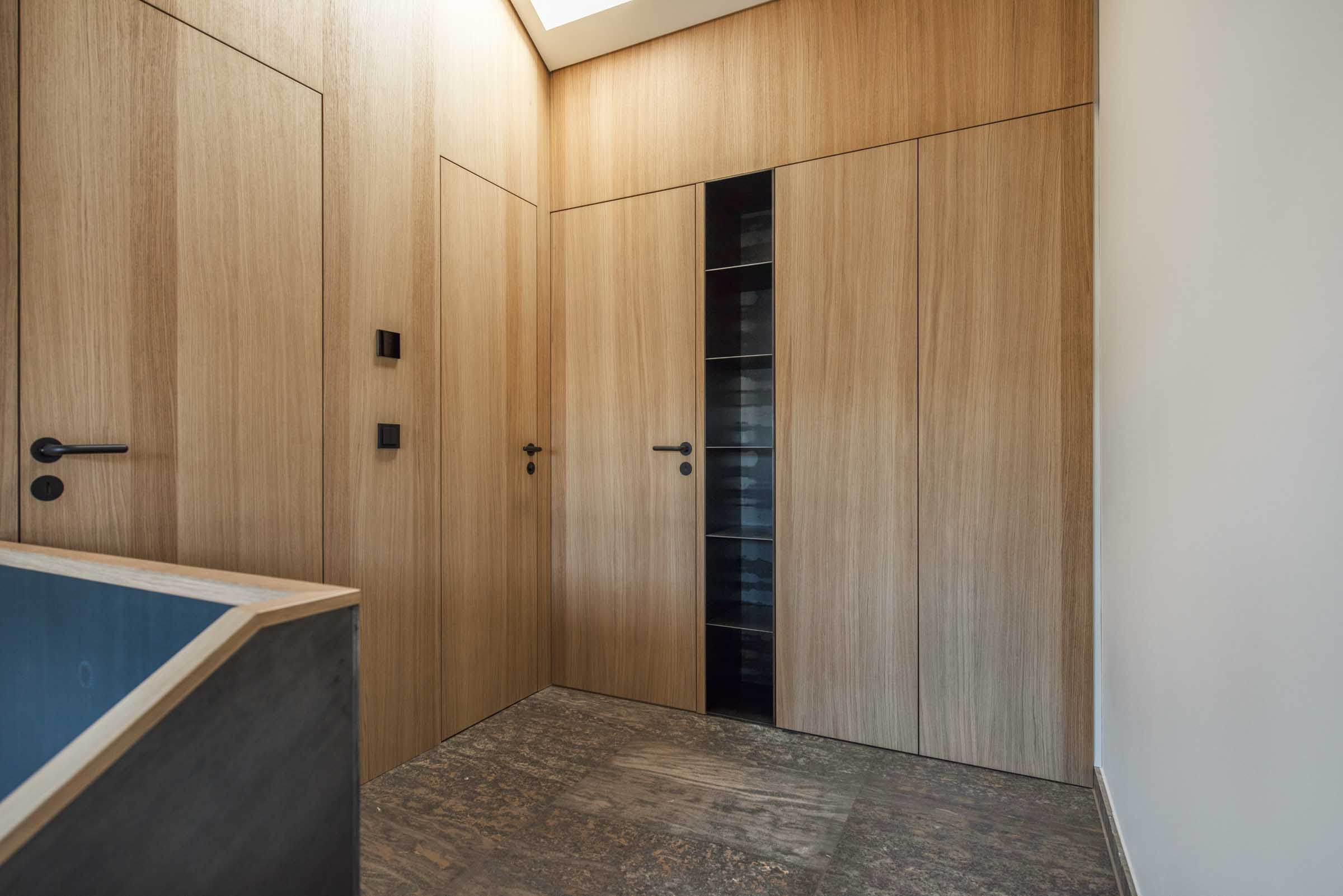 Schon beim Eintreten empfängt das Haus mit präzise gearbeiteten Einbauten aus Eiche, die Räume ordnen und Übergänge definieren.