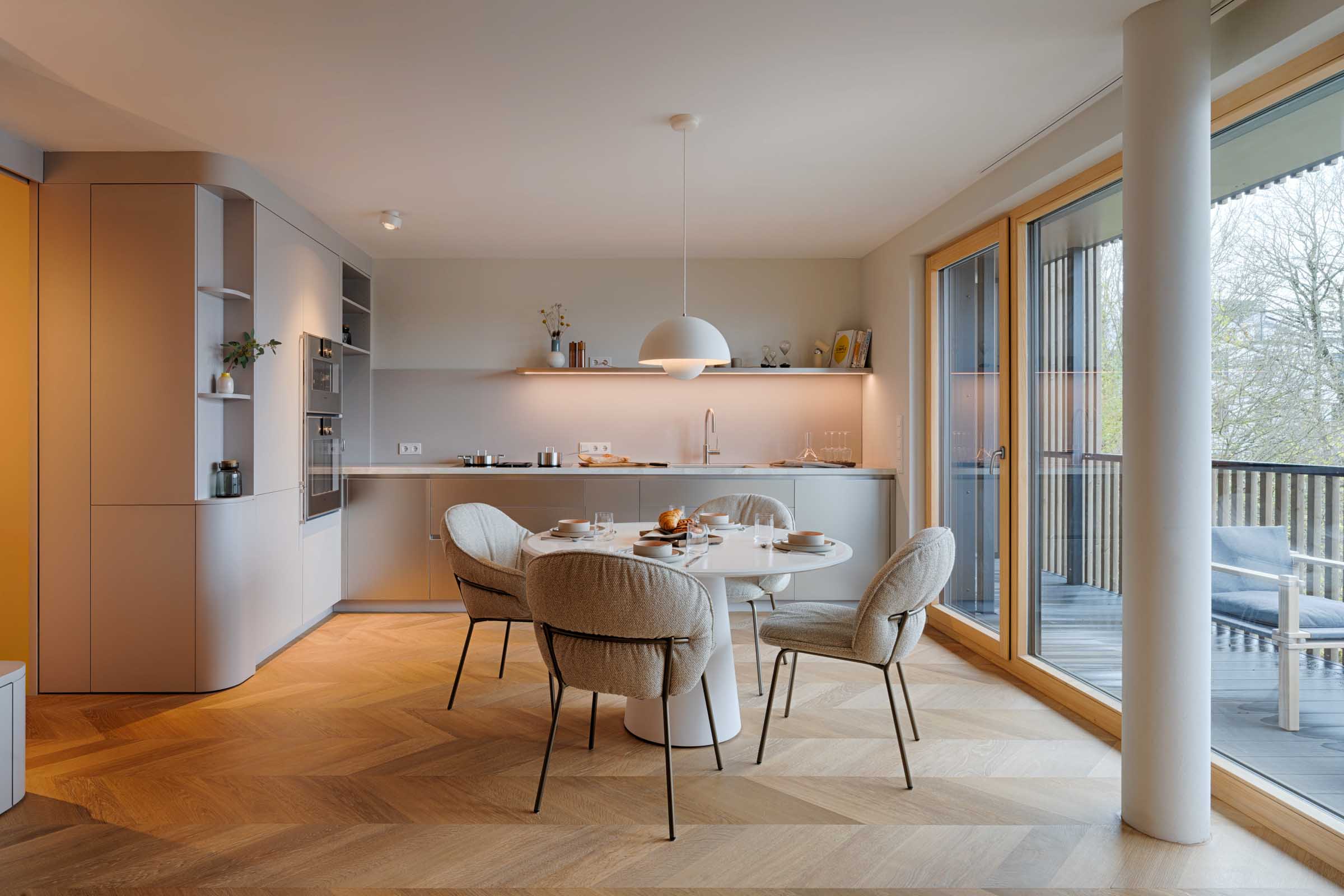 Ein Interieur als ruhiger Rückzugsort – geprägt von sanften Tönen, feinen Rundungen und dem Mut zur Farbe. Für ein Paar, das gleichermaßen Rückzug wie Gastlichkeit schätzt, entstand ein maßgeschneiderter Wohnraum, der Ästhetik und Alltag in Einklang bringt.