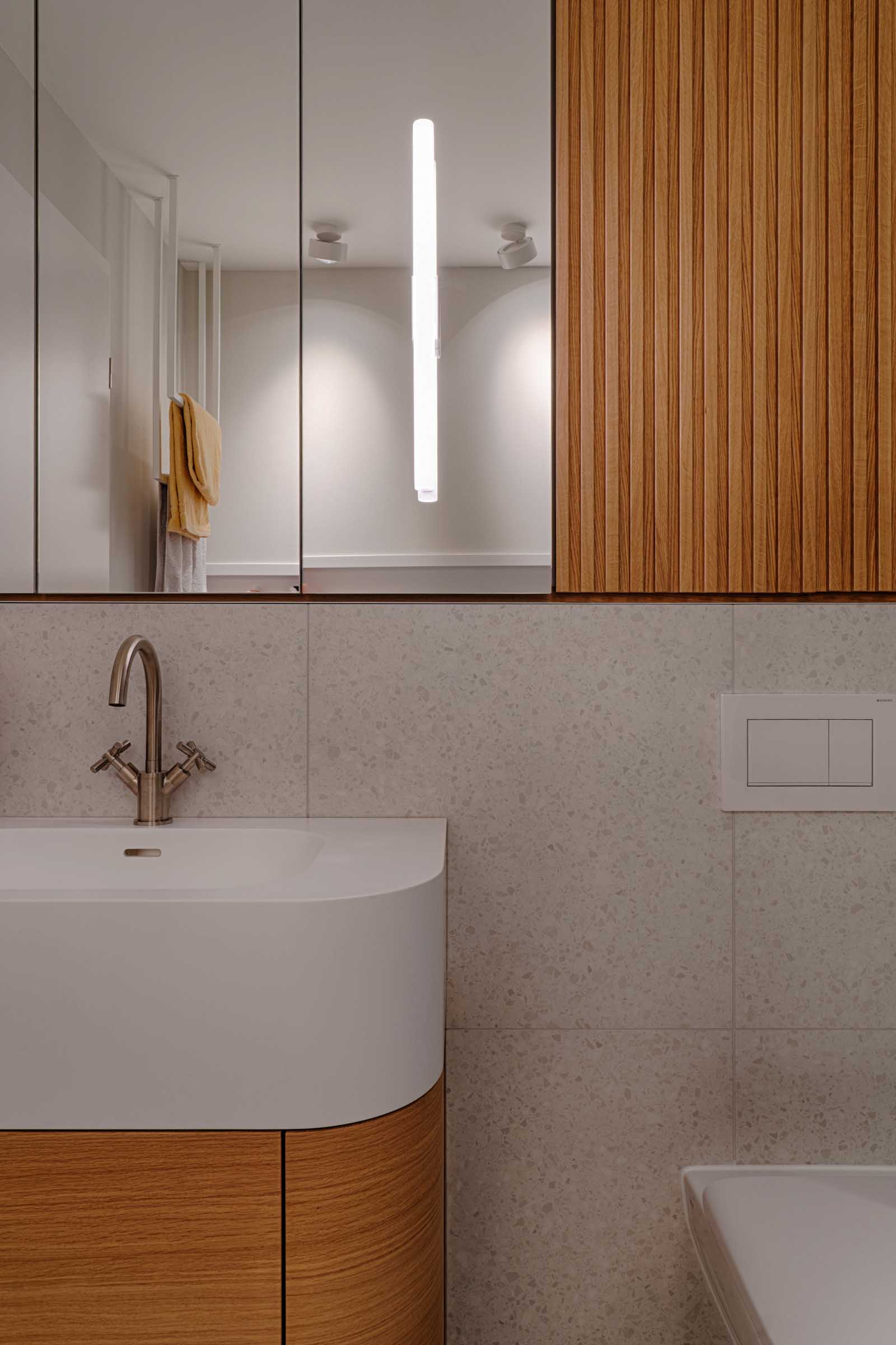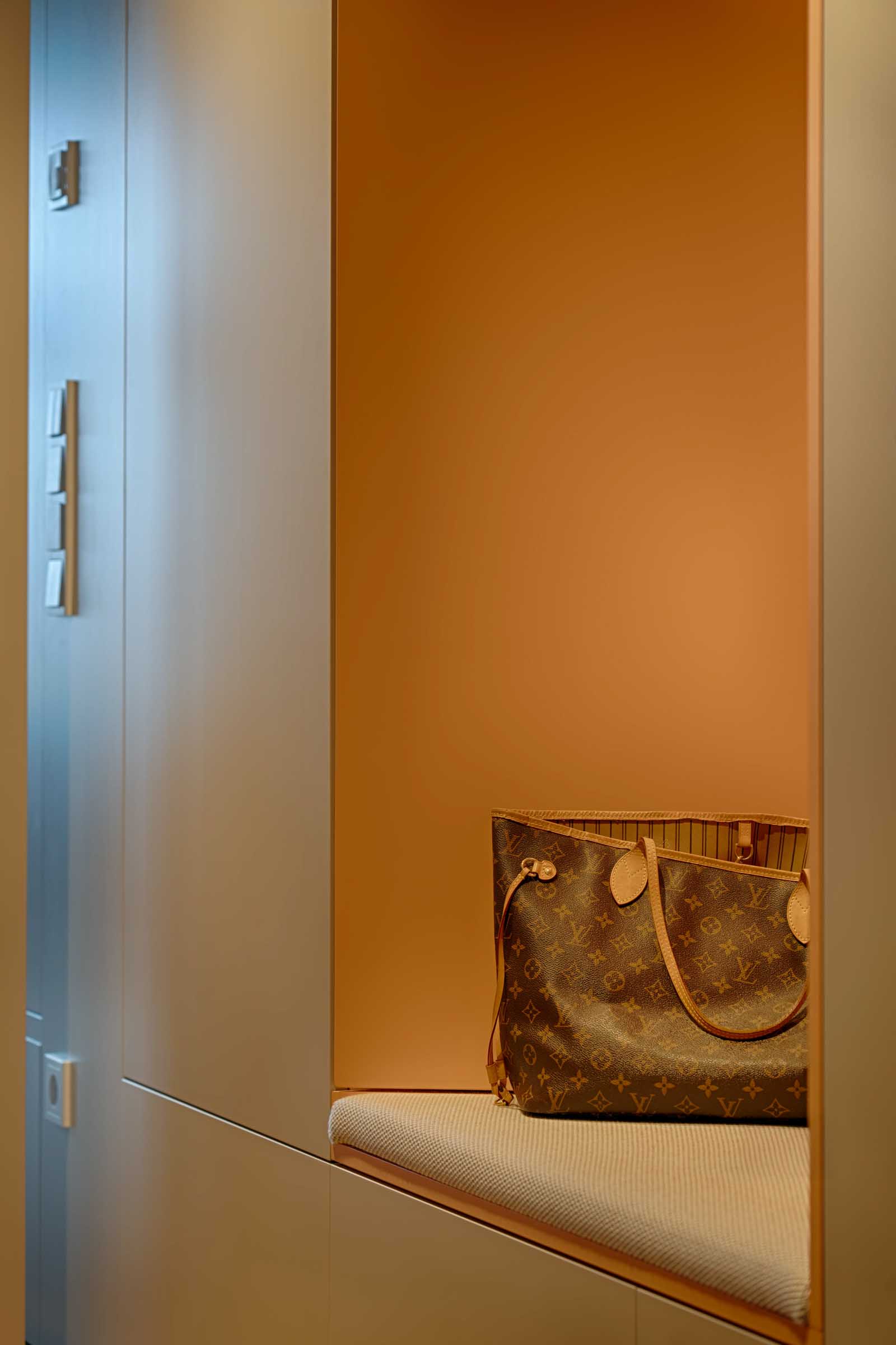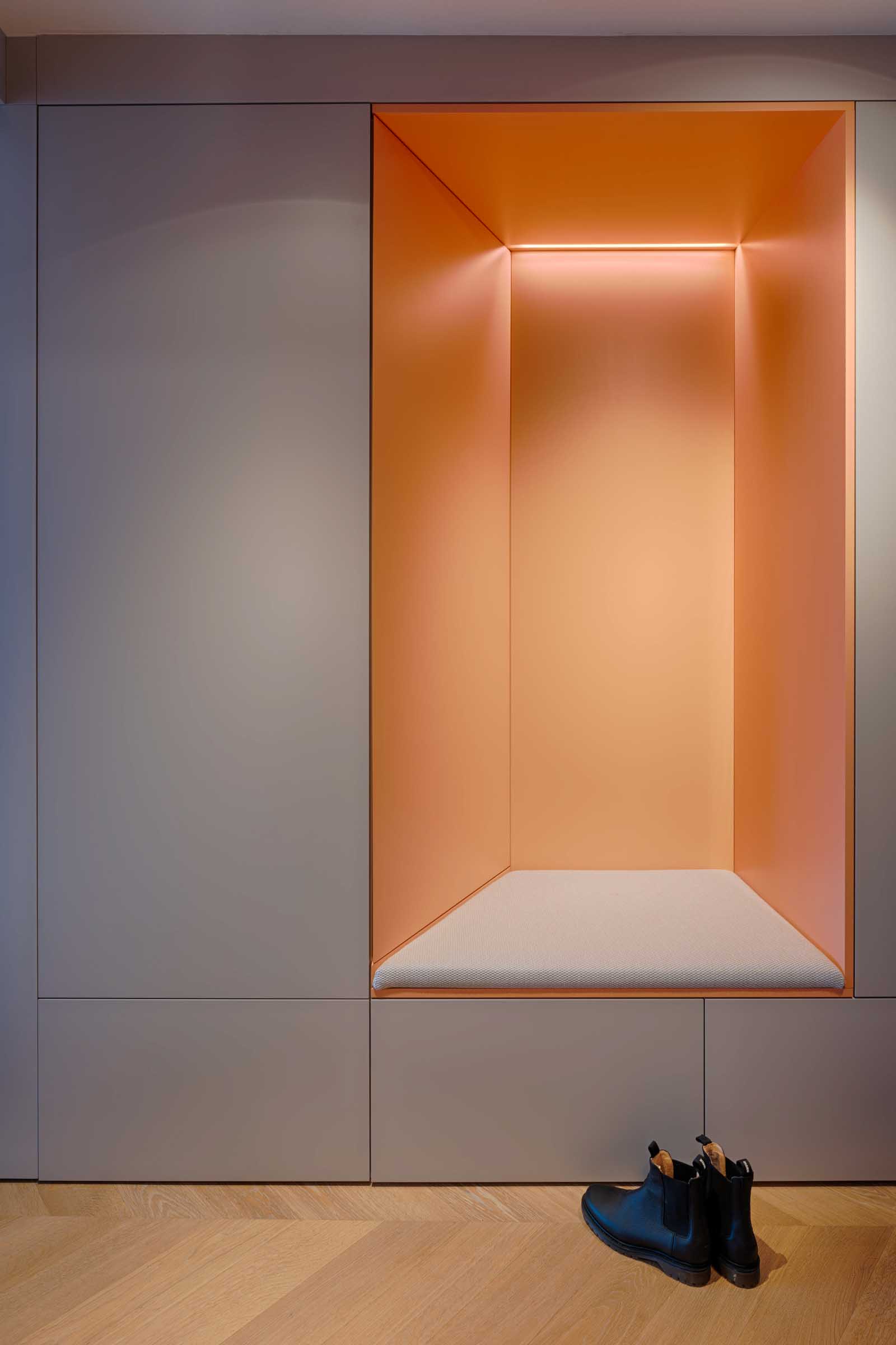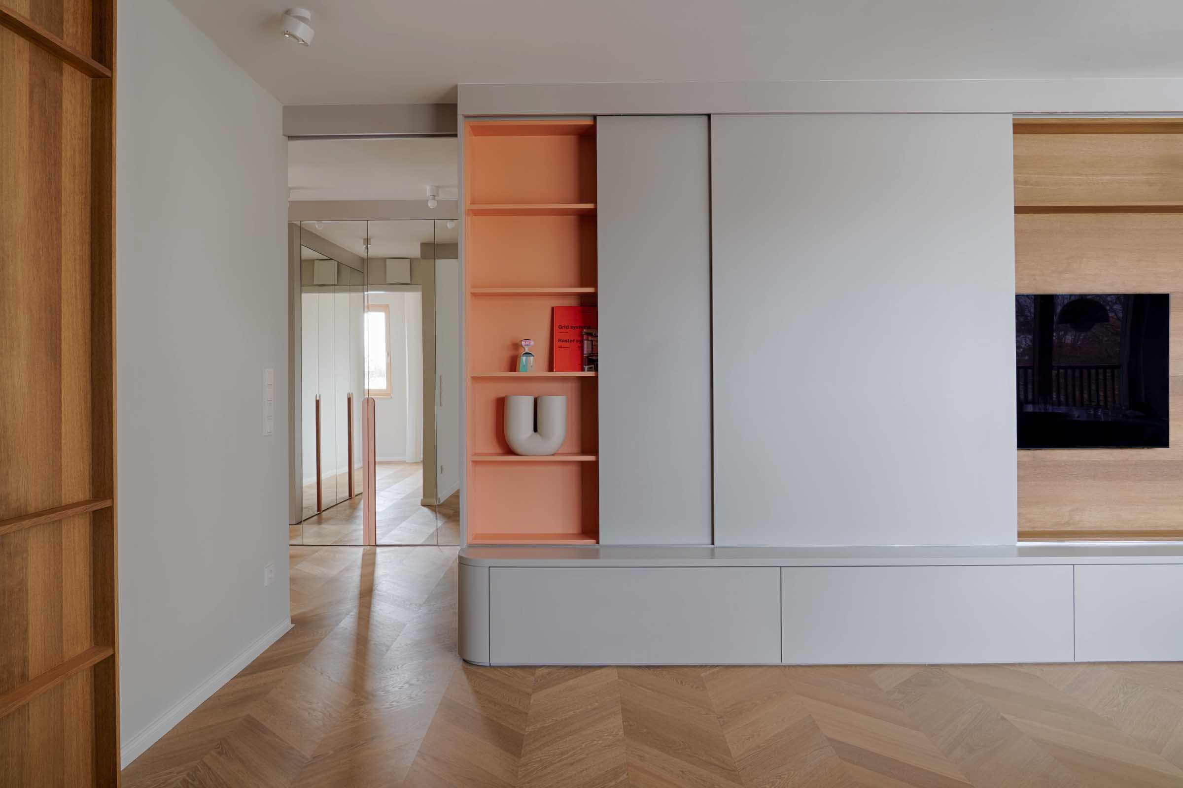 Das Apartment wurde als stimmiges Gesamtkonzept entworfen: Einbaumöbel strukturieren den Grundriss, zonieren den offenen Raum und schaffen gleichzeitig großzügigen, unaufdringlichen Stauraum.