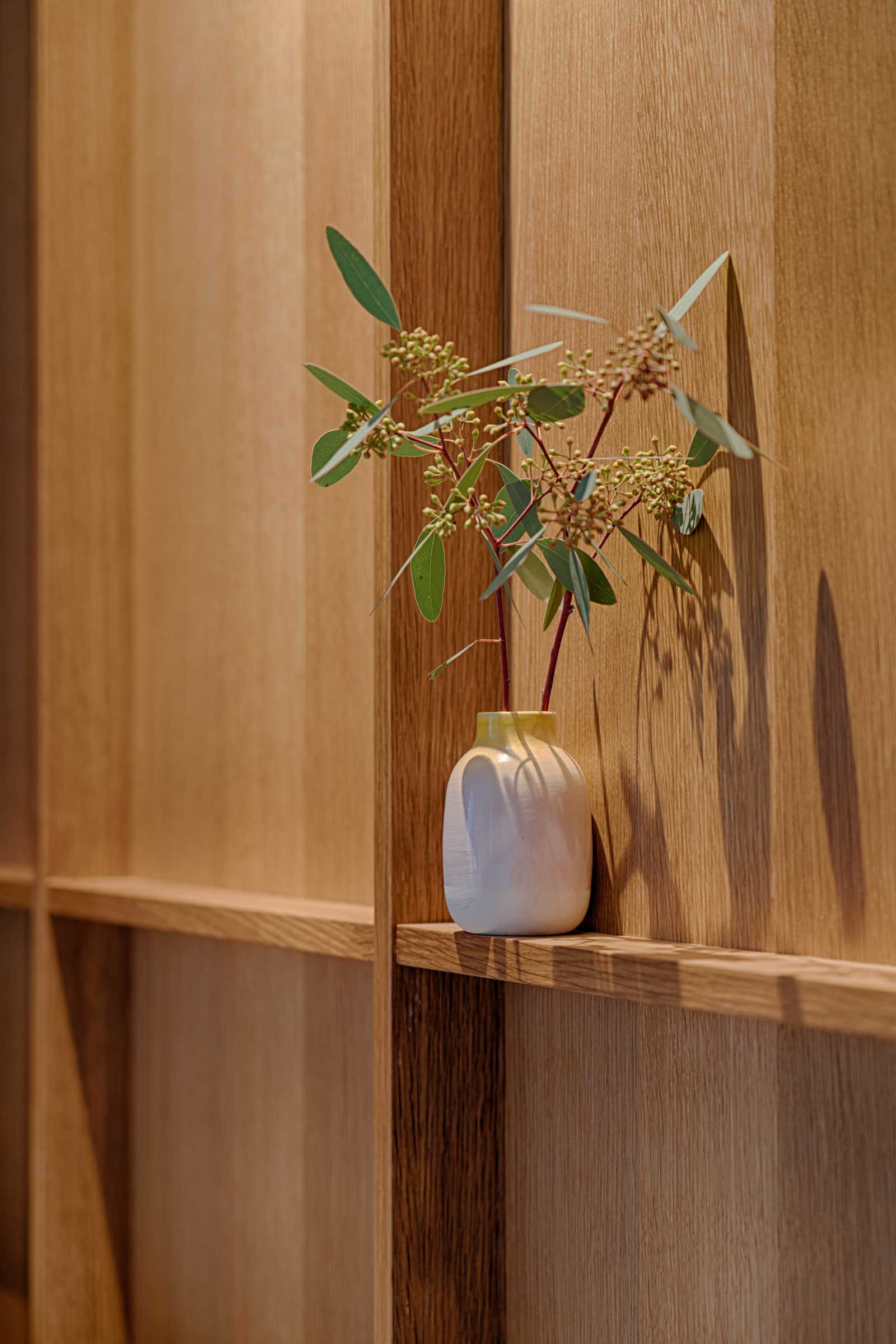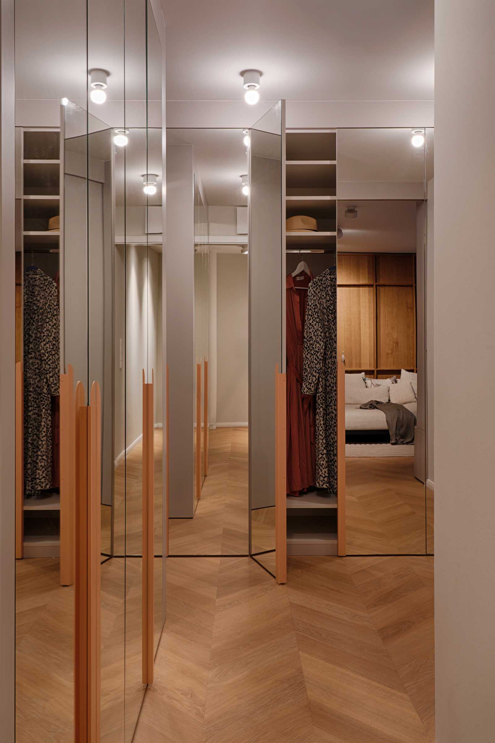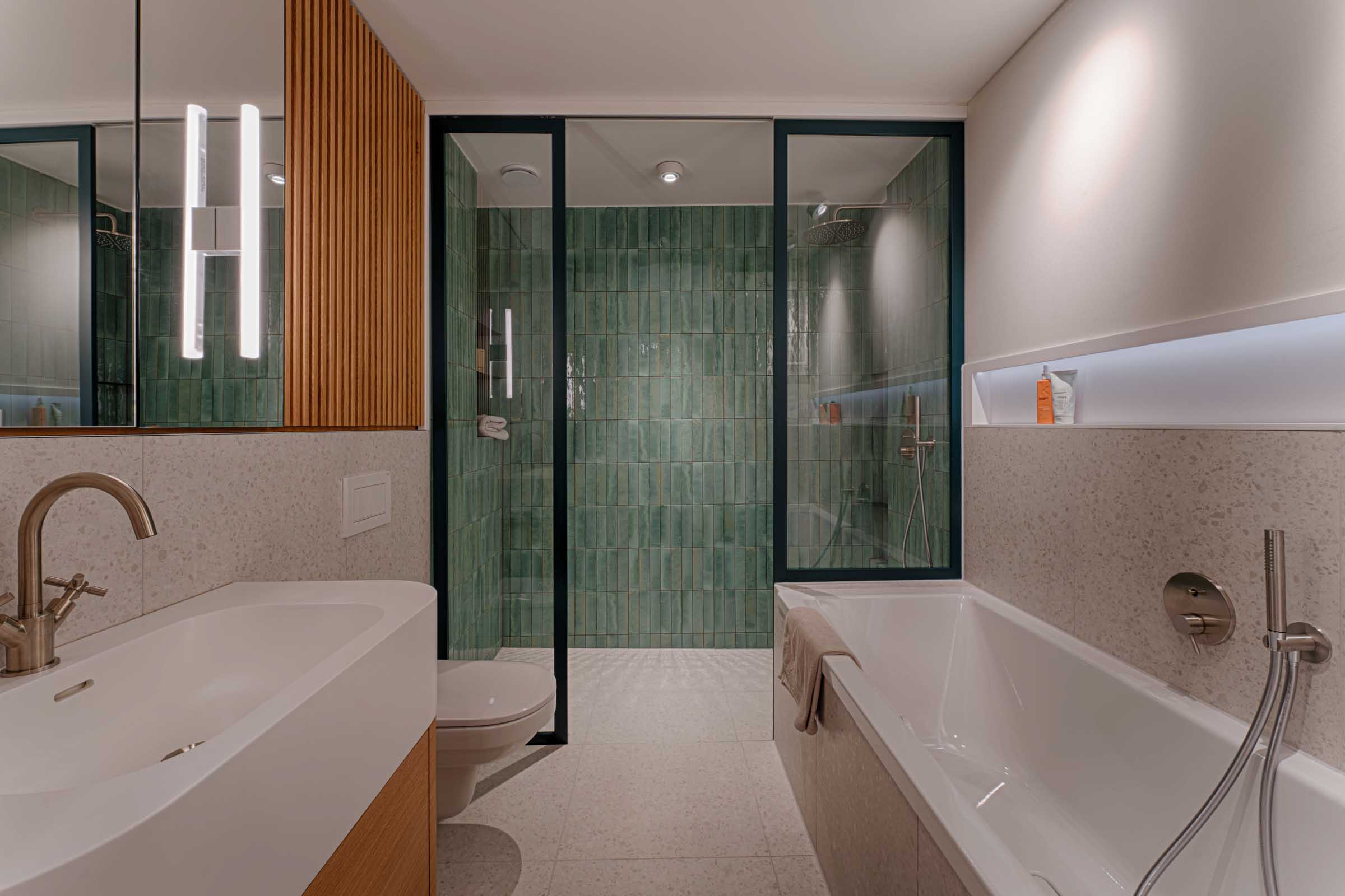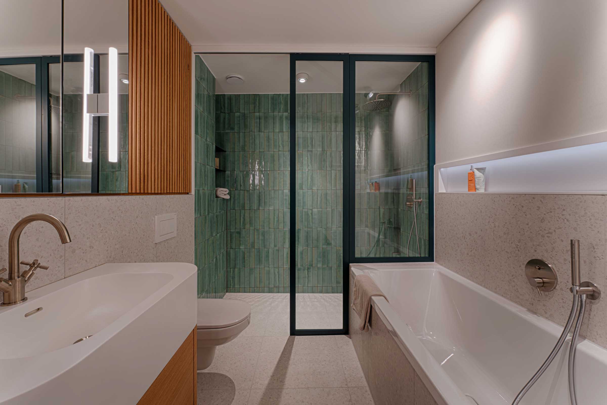 Das Apartment wurde als stimmiges Gesamtkonzept entworfen: Einbaumöbel strukturieren den Grundriss, zonieren den offenen Raum und schaffen gleichzeitig großzügigen, unaufdringlichen Stauraum.