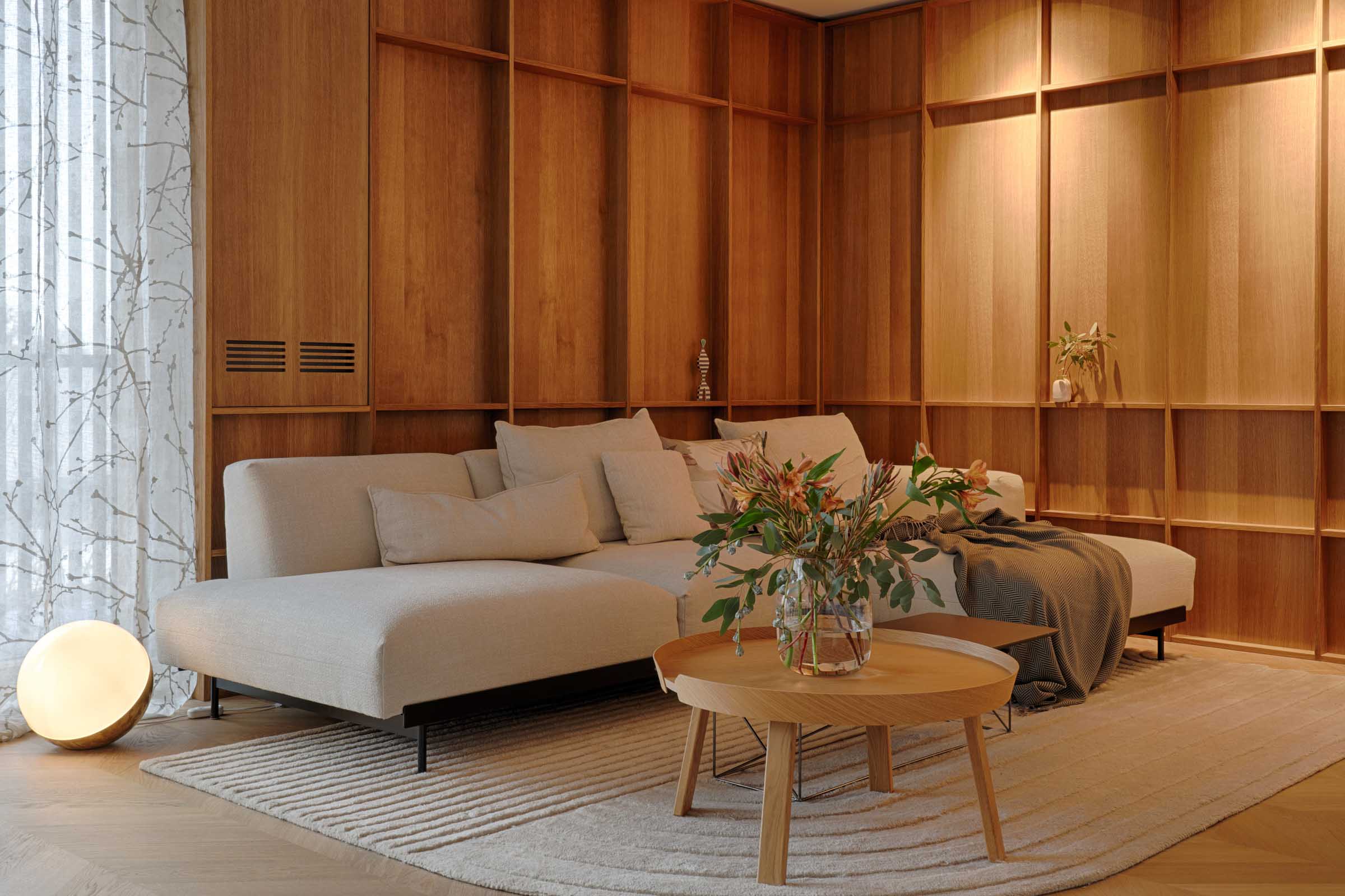 Die Materialien sind warm, haptisch und mit Bedacht gewählt – ein weiches, warmes Grau, geräucherte Eiche und textiler Komfort schaffen eine ruhige, taktile Atmosphäre.